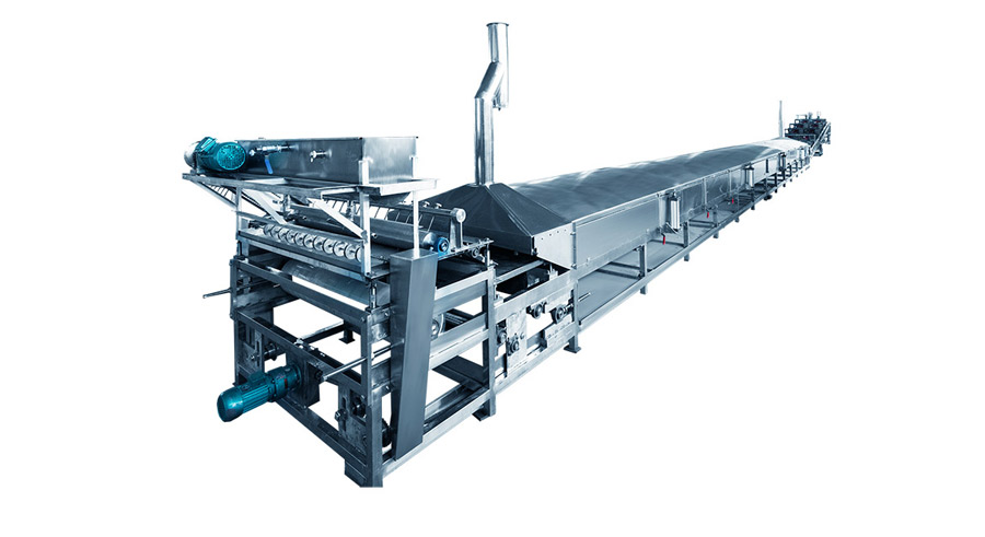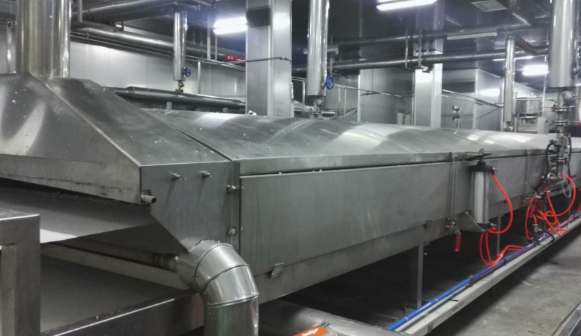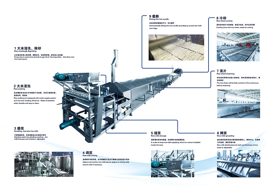 布好漿的網(wǎng)帶自動進入蒸粉機,將米漿蒸熟成米粉片,熟化效果好;