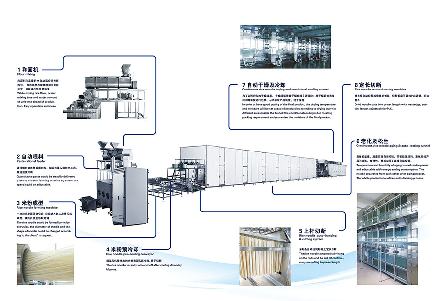 該生產(chǎn)線可用于生產(chǎn)江西米粉、桂林米粉等直條米粉用,產(chǎn)品直徑從1.0mm到1.6mm可調(diào),生產(chǎn)出的直條米粉質(zhì)地緊密、外形均勻、條型整齊、口感滑爽Q彈,可煮可炒。生產(chǎn)線設(shè)計(jì)科學(xué)、工藝合理、操作簡單、使用人工少、故障率低、自動(dòng)化程度高,可實(shí)現(xiàn)生產(chǎn)過程標(biāo)準(zhǔn)化。除可生產(chǎn)普通米線外,本生產(chǎn)線還可用于紅米、黑米等其他復(fù)配原料的生產(chǎn),為廣大消費(fèi)者提供更多的選擇。